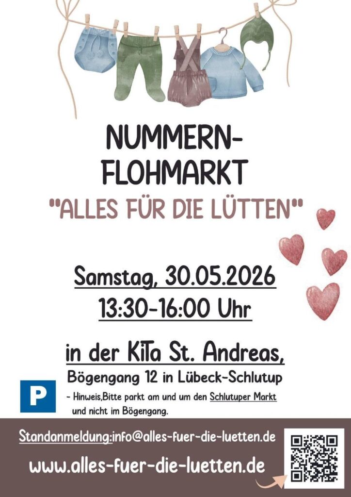 Am Samstag, den 30.05.2026, findet in der Kita St. Andreas in Lübeck wieder unser gemütlicher Kinderflohmarkt (in diesem Jahr als Nummernflohmarkt) statt. Wir würden uns sehr freuen, euch als Gäste begrüßen zu können 🙂